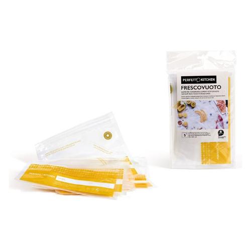 Buste alimentari Frescovuoto di piccole dimensioni con chiusura e valvola, per conservare sottovuoto cibi freschi e secchi. Da utilizzare con Frescovuoto Pump. senza BISFENOLO ( BPA free). Confezione da 6 buste SMALL cm 23 x 21