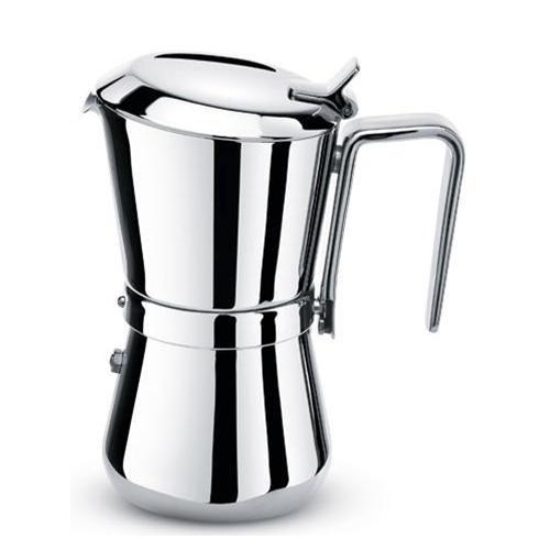 Caffettiera con chiusura a scatto grazie alla rotazione del manico che si aggancia direttamente alla parte inferiore della caffettiera. Grazie al filtro riduttore in dotazione si possono erogare due diverse quantità di caffè. Produzione artigianale made in italy.