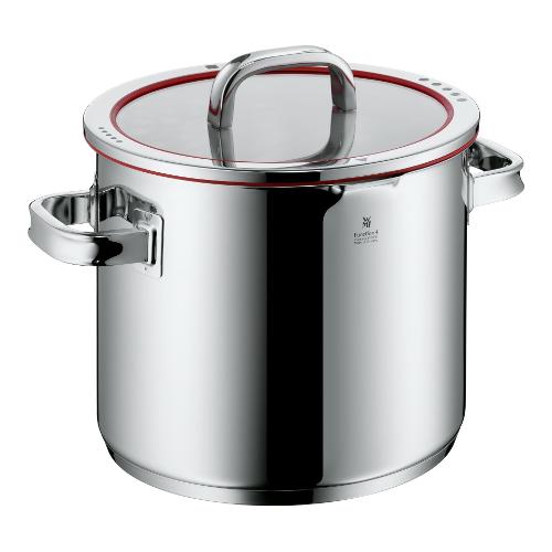 Pentola function4 con coperchio può essere messo in 4 posizioni selezionate. A seconda della posizione si può vuotare completamente il liquido con coperchio chiuso. Grossi fori nel coperchio per scolare la pasta, quelli piccoli per scolare il riso e con il coperchio in posizione chiusa è possibile una cottura con poca acqua