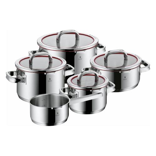 Composizione: pentola bassa con coperchio Ø 20 cm (2,5 l), 3 pentole alte con coperchio Ø 16 cm (1,9 l), Ø 20 cm (3,9 l), Ø 24 cm (5,7 l), 1 casseruola con manico senza coperchio Ø 16 cm ( 1,4 l)