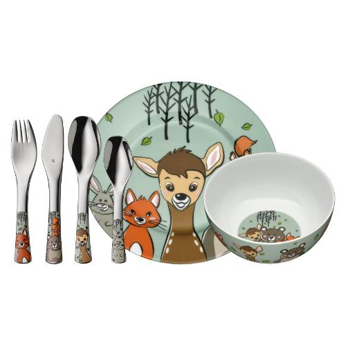 I forest friends di wmf saranno i più cari amici del tuo piccolo mangiatore. Questo set di stoviglie per bambini da 6 pezzi riunisce un improbabile gruppo di migliori amici, in un design adatto ai bambini che migliora le capacità di mangiare in modo indipendente, rendendo ogni pasto un'avventura. Cervi, orsi, volpi, conigli e scoiattoli accolgono amorevolmente il tuo bambino nel loro mondo, con un set completo che include una forchetta, un coltello, un cucchiaio, un cucchiaino, un piatto di porcellana e una ciotola per bambini, ideali per scoprire la pura gioia di mangiare da soli.