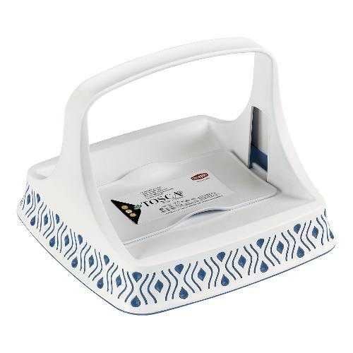 Portatovaglioli orizzontale in materiale plastico, pratico ed elegante. Decorato con delicati intarsi in tortora o palace blu è composto da fermatovaglioli e da una utile impugnatura che facilita lo spostamento. Idoneo al contatto alimentare