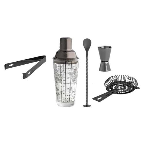 Il set è composto da Shaker, filtro ghiaccio, misurino, pinza per ghiaccio, pestello, cucchiaino mixer e versatore