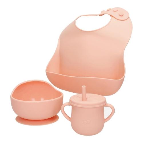 Confezione include 1 scodella (d.12x8 cm) con ventosa, 1 bicchiere (200 ml) con tappo e cannuccia, 1 bavaglio (26x23 cm) con raccogli pappa