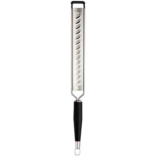 Grattugia per cioccolato in acciaio inox e manico ergonomico antiscivolo la pasticceria di precisione iginio massari. Affilatissima, resistente e leggera, con speciali tagli inclinati per ottenere dal cioccolato piccole scaglie o altre decorazioni per torte, paste o cioccolatini. Griglia per grattugiare precisa e studiata ad hoc. La parte in plastica superiore stabilizza lo strumento una volta che viene appoggiato al piano di lavoro. Dotato di proteggi lame. Manico ergonomico in acciaio inox fotoinciso