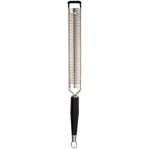 Grattugia per agrumi in acciaio inox, manico ergonomico in materiale antiscivolo. Resistente e leggera, grazie agli speciali tagli fotoincisi studiati per le scorze è possibile ottenere facilmente solo la parte aromatica dell'agrume. La parte in plastica superiore stabilizza lo strumento una volta che viene appoggiato al piano di lavoro. Dotato di proteggi lame