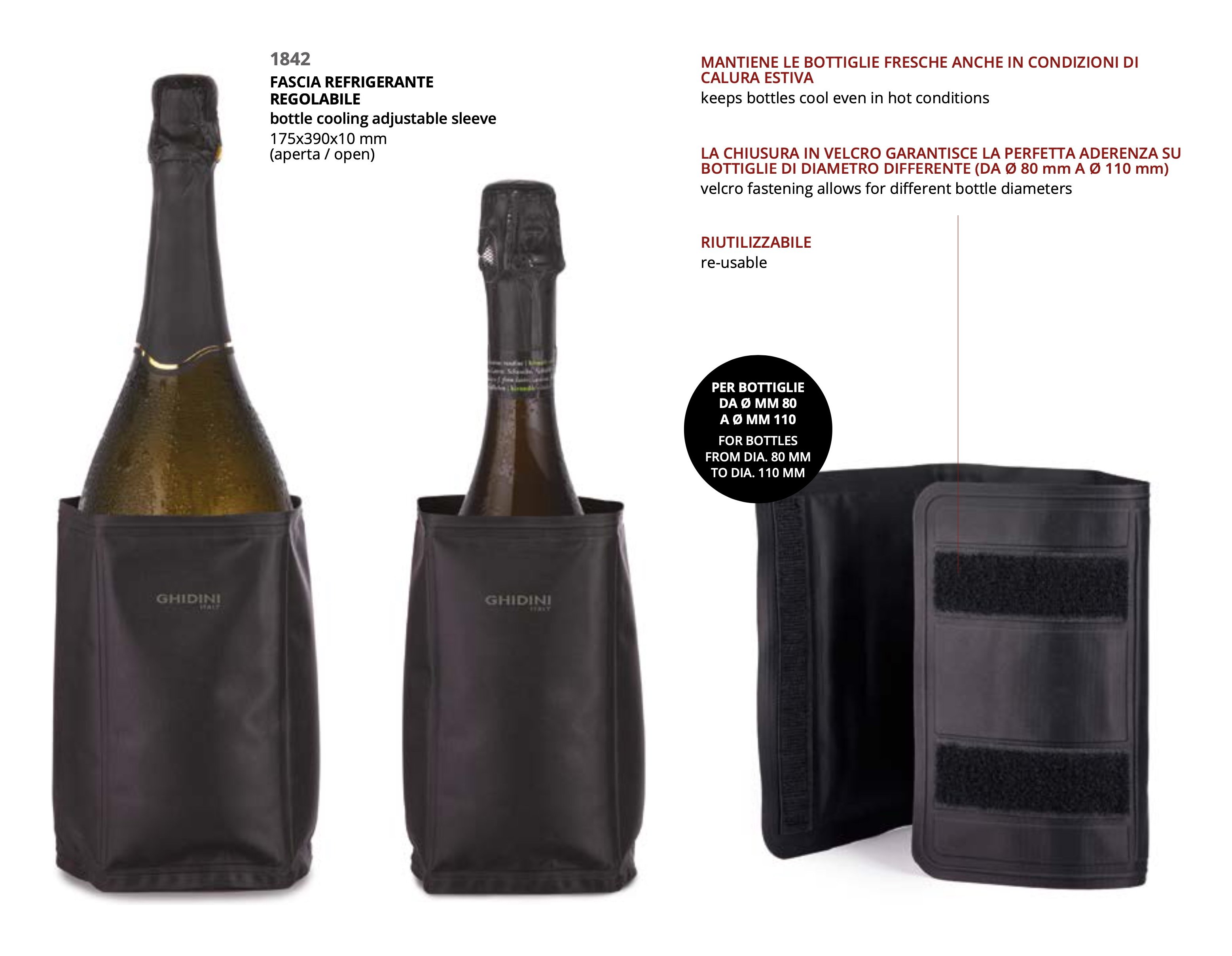 Mantiene le bottiglie fresche anche in condizioni di calora estiva. La chiusura in velcro garantisce la perfetta aderenza su bottiglie da d. 80 a 110 mm