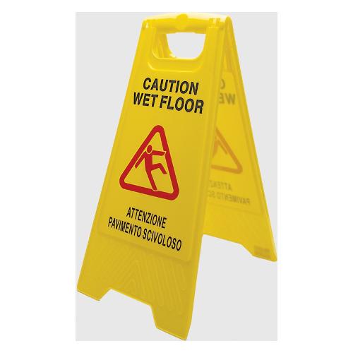 Segnale in plastica "pavimento bagnato", bifacciale, richiudibile per agevolare il trasporto.