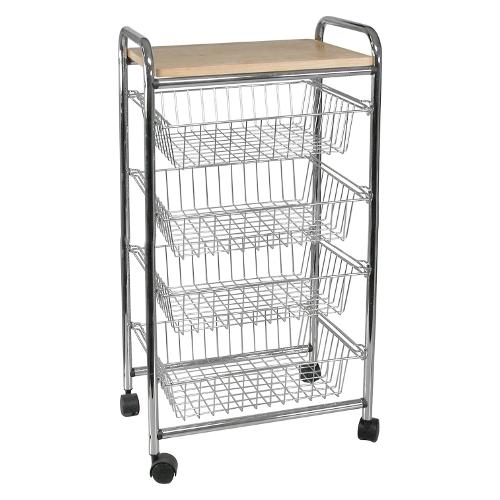Carrello cucina salvaspazio cromato con 4 cesti estraibili e maniglie in plastica. Struttura in tubo metallico diametro 19 mm, vassoio in legno massello. 4 ruote piroettanti in plastica con perno metallico. Puo' essere utilizzato in cucina come porta frutta, barattoli, pasta ecc. Con comodo tagliere di legno removibile, puoi tagliare quello che vuoi
