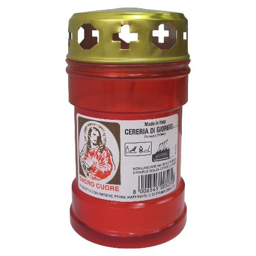 Cero votivo dedicato al sacro cuore, modello p30 realizzato in cera bianca con contenitore in pvc rosso. Dotato di parapioggia per proteggere la fiamma dall'acqua. Durata cero votivo: 30 ore.