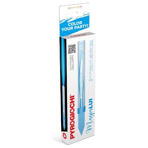Fontane pirotecniche Pyrogiochi serie Magia Lui in confezione da 3 con fiamma colorata celeste. Una volta accese le candele con scintille sprigionano una fiamma color azzurro e sono ottime per festeggiare compleanni, addii al celibato e feste al maschile! Il ungo puntale alla base idoneo al contatto con gli alimenti, garantisce un ottimo fissaggio su torte o supporti non infiammabili. Idonee all'uso all'interno di abitazioni e complete di stick di innesco per l'accensione. libera vendita CAT. F1 con rischio potenziale molto basso. Prodotte nel rispetto dell'Art. 1 del D.lgs. 123/2015 in attuazione della direttiva europea 2013/29/UE.