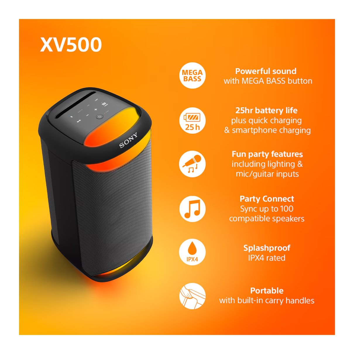 Porta la festa sempre con te con il party speaker wireless SRS-XV500. Questo speaker offre un audio potente, un'illuminazione integrata e una batteria a lunga durata: puoi persino collegare un microfono per il karaoke e cantare tutta la notte. Con XV500, hai tutto il necessario per intrattenere amici e parenti.