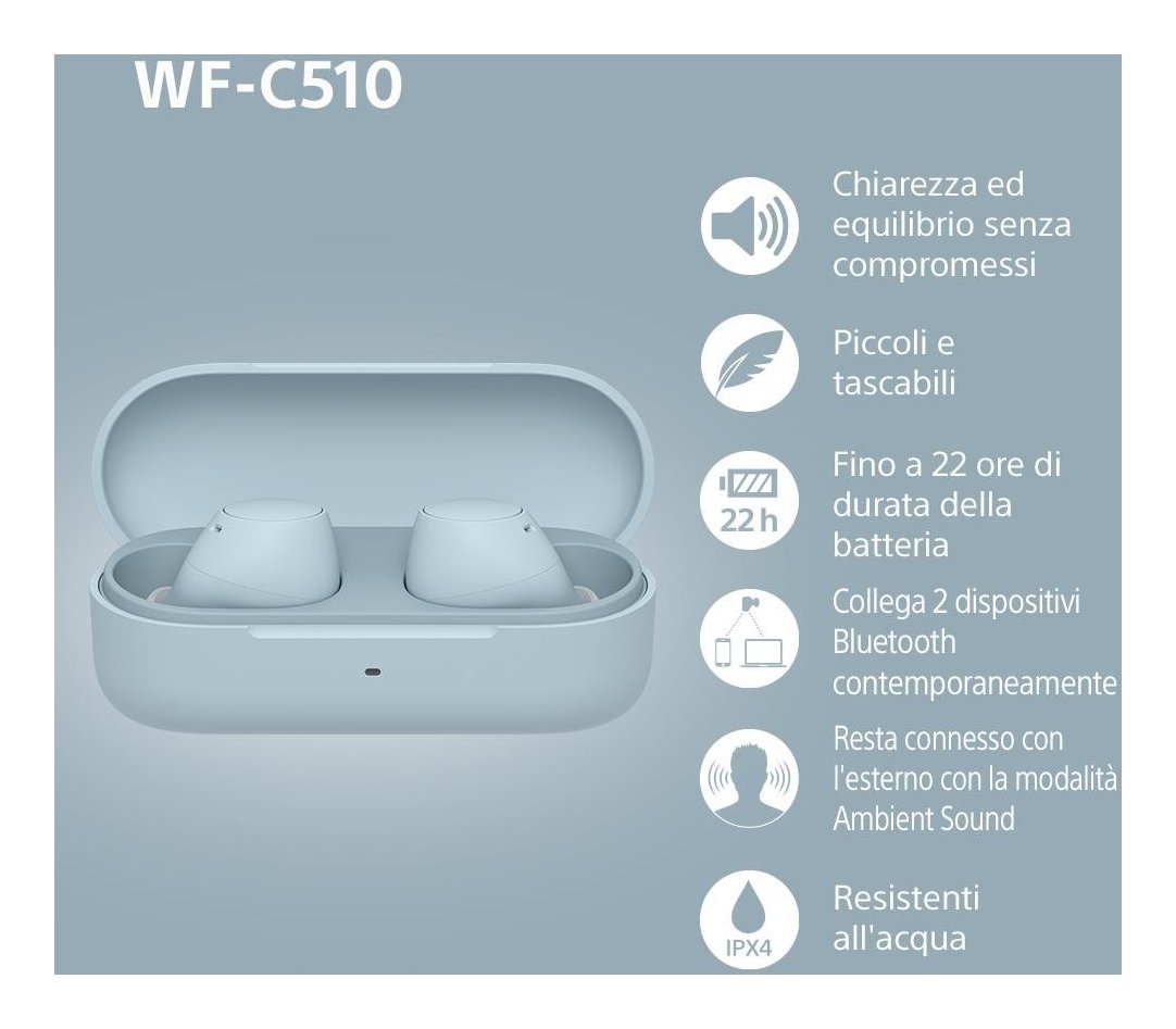 Ti presentiamo gli auricolari Sony WF-C510: incredibilmente comodi, con una fantastica qualità del suono e ricchi di funzionalità, questi sono tra i nostri auricolari più piccoli e leggeri di sempre!
