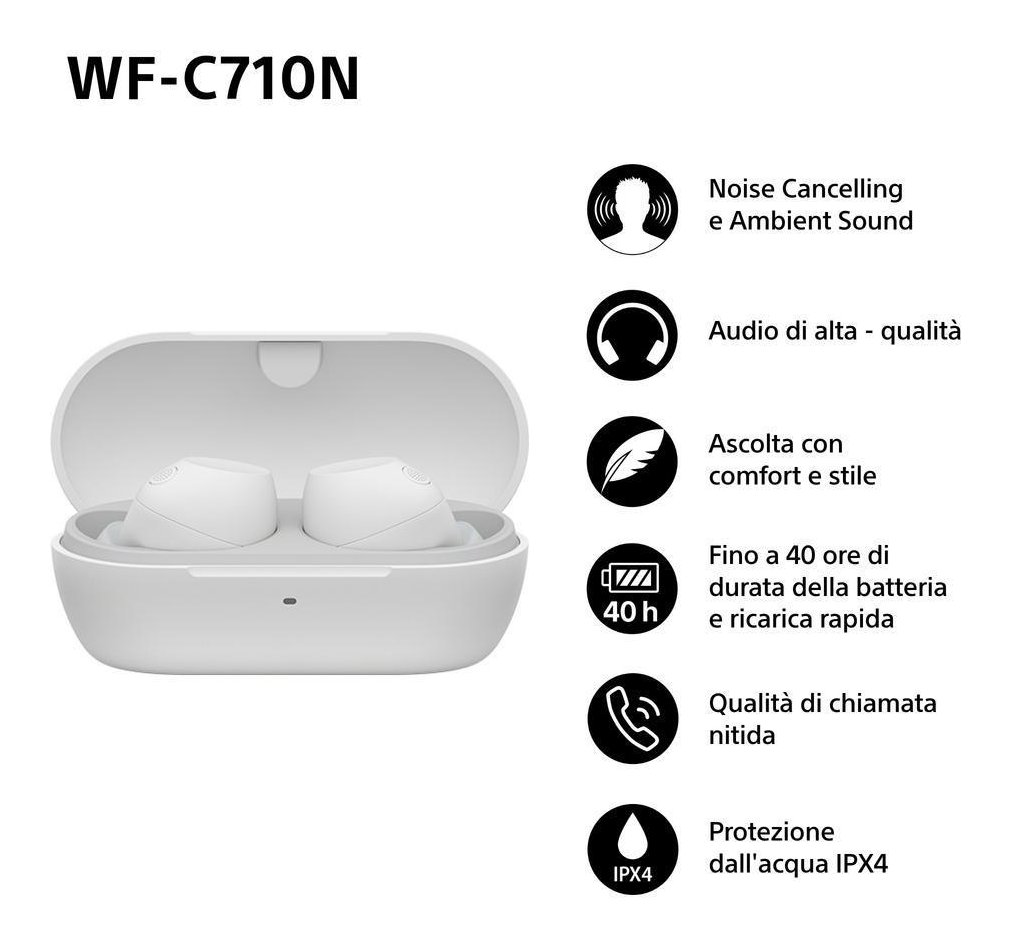 Cuffie True Wireless con Noise Cancelling e 4 microfoni, perfette per l'uso quotidiano, vestibilità comoda, suono di alta qualità con DSEE, EQ personalizzabile tramite app, 360 Reality Audio, 30ore di autonomia, ricarica rapida, connessione Multipoint, resistenza all'acqua IPX4 e funzionalità smart.