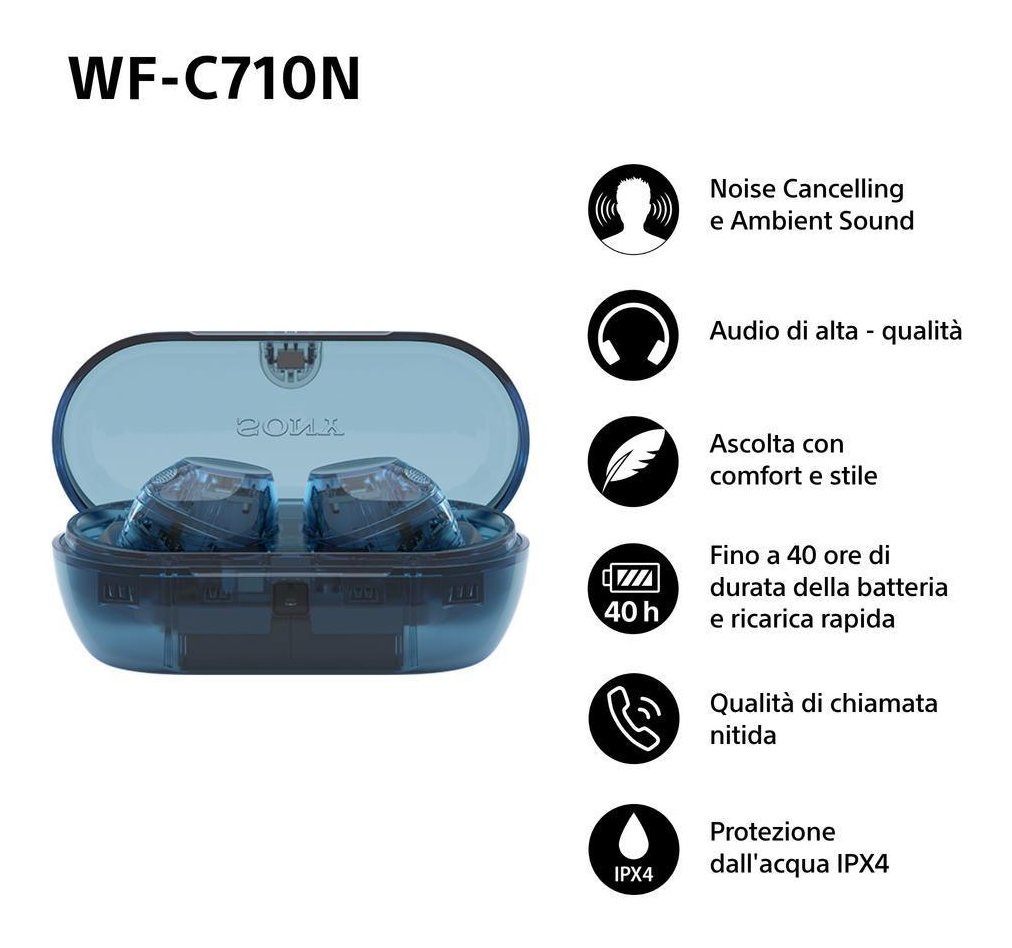 Cuffie True Wireless con Noise Cancelling e 4 microfoni, perfette per l'uso quotidiano, vestibilità comoda, suono di alta qualità con DSEE, EQ personalizzabile tramite app, 360 Reality Audio, 30ore di autonomia, ricarica rapida, connessione Multipoint, resistenza all'acqua IPX4 e funzionalità smart.