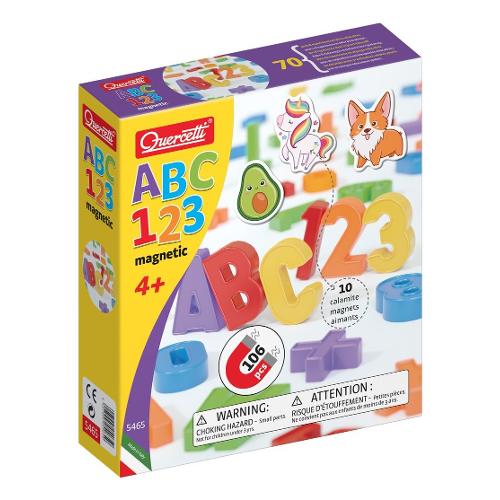 48 lettere magnetiche, 48 numeri magnetici e 10 cifre magnetiche per comporre le prime parole o sillabe, per fare le prime operazioni matematiche o per scrivere le prime frasi sulla porta del frigorifero o su qualsiasi altra superficie metallica.