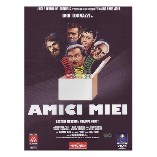 Un giornalista divorziato e in perenne conflitto con un figlio troppo preciso ed ordinato, un sedicente nobile decaduto che perde la testa per una ragazza lesbica, un geometra con visioni mistiche, un barista dalla gag facile e un primario ospedaliero goliardico e impudente : le "zingarate" di cinque amici toscani, interpretati da altrettanti attori di bravura insuperata, narrate con un piglio cinico e sarcastico che ha fatto epoca nel cinema italiano. Inizialmente destinato alla direzione di Pietro Germi e poi affidato a Mario Monicelli, "Amici Miei" è una sorta di ponte tra la comicità della cosidetta "commedia all'italiana" degli anni sessanta e l'amarezza dei primi settanta. Alcune sequenze (gli schiaffi gratuiti ai passeggeri dei treni fermi alla stazione, la bizzarra degenza ospedaliera, etc), battute (la famigerata "supercazzola prematurata") e canzoncine ne perpetuano negli anni l'enorme portata comica e ne fanno un capolavoro assoluto del nostro cinema di ogni tempo.