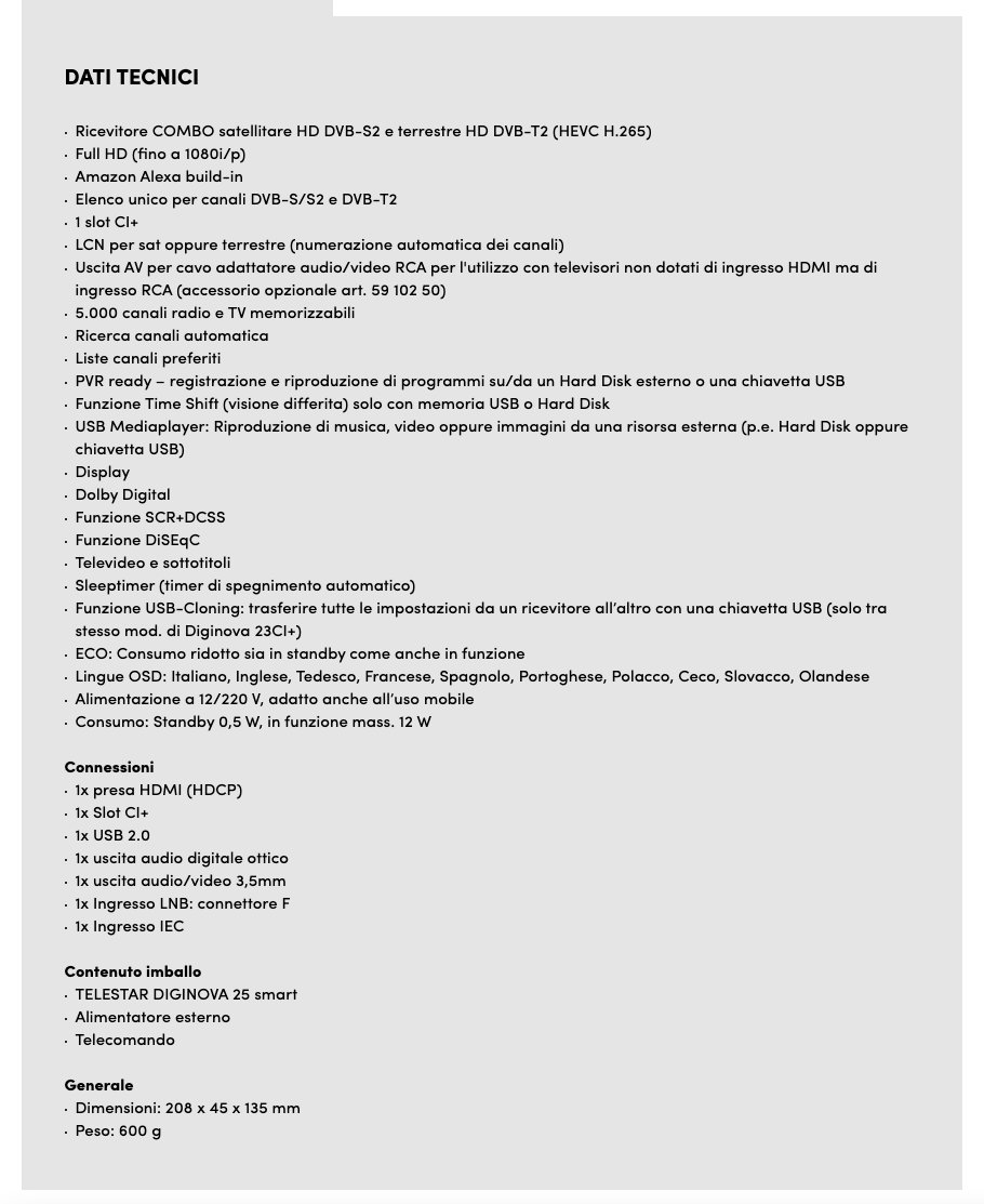 Il ricevitore riceve sia la TV satellitare ad alta risoluzione (DVB-S2) che il digitale terrestre ad alta risoluzione (DVB-T2 H.265) in qualità HD. Grazie all'interfaccia CI+, il ricevitore può essere aggiornato per ricevere programmi criptati come tivùsat. Collegato a un supporto di memorizzazione esterno via USB, DIGINOVA 25 smart si presenta come un videoregistratore digitale. Sono supportate le registrazioni (funzione PVR incl. riproduzione in TimeShift) su supporti dati esterni. Può essere il centro di controllo della Smart Home se il ricevitore è collegato ad una rete con una connessione Internet e viene utilizzato insieme al TELESTAR SMART VOICE KIT (art. 54 001 58, non compreso nella fornitura). Nella sua versione standard, il ricevitore può essere controllato tramite comando vocale (se è integrato in una rete insieme a un Amazon Echo o simile).