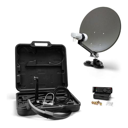 l KIT portatile è l’ideale per camper, roulottes, camion, barche, cioè per tutte le persone in viaggio che non si vogliono negare il piacere di ricevere la TV satellitare digitale. Tutti i componenti vengono forniti in una robusta valigetta per facilitare il trasporto. In dotazione troverete anche un piedistallo a ventosa per fissare la parabola in modo sicuro su superfici liscie e/o inclinate.