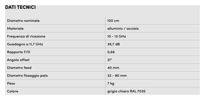 Parabola offset in alluminio verniciato a polvere e supporto AZ/EL in acciaio zincato.