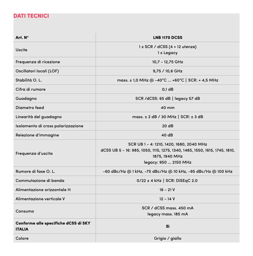 LNB dCSS con 2 uscite per collegare fino a 17 ricevitori satellitari idonei. Questo LNB supporta in parallelo sia il sistema SCR con le 4 bande e frequenze tradizionali SCR che anche 12 ulteriori bande con protocollo dCSS, per i servizi SKY Italia. La schermatura elevata impedisce che i segnali LTE-4G e 5G interferiscono sulla banda satellitare e creano così disturbi nella ricezione del segnale DVB-S/S2.