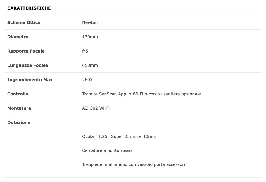 La serie di telescopi Sky-Watcher AZ-GO2 Wi-Fi rappresenta la sintesi ideale tra facilità di utilizzo ed evoluzione tecnologica. La collaudata tecnologia SynScan Wi-FI offre tutto il necessario per l’allineamento ed il puntamento del telescopio direttamente dal proprio dispositivo, smartphone o tablet. L’app SynScan gratuita scaricabile dagli store Apple e Android è facile da usare ed intuitiva e consente veloci allineamenti garantendo lunghe e soddisfacenti sessioni di osservazione. I telescopi AZ-GO2 sono leggeri, compatti, facilmente trasportabili e sono dotati di treppiede d’alluminio leggero richiudibile e di vassoio porta accessori. Le fasi di allineamento e puntamento sono supportate da un cercatore a punto rosso. In dotazione anche due oculari da 10mm e 25mm.