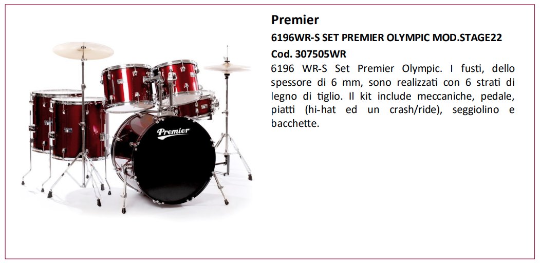 I fusti, dello spessore di 6 mm, sono realizzati con 6 strati di legno di tiglio. Il kit include meccaniche, pedale, piatti (hi-hat ed un crash/ride), seggiolino e bacchette.