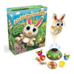 Tranquillamente seduto in cima alla sua tana, il nostro coniglietto ammira il suo campo di carote! Estrai le carote, ma fai attenzione a non spaventarlo! Rimani concentrato per essere pronto ad afferrarlo appena tenta di scappare! Acchiappa il coniglio è un gioco di società e di azione (action game) che stimola i riflessi del tuo bambino o della tua bambina, inoltre insegna i numeri, il conteggio e i colori. La confezione contiene: 1 Base di gioco (Tana), 1 Coniglio, 12 Carote, 1 Ruota con caselle di selezione attività, 4 Cestini colorati, 1 Manuale di istruzioni.