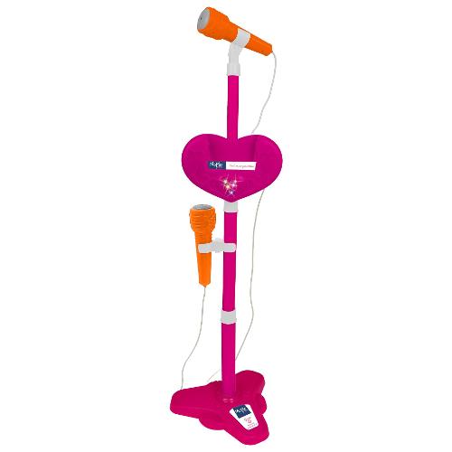 Microfono da palcoscenico con 2 microfoni - connessione wireless: connessione ad una fonte musicale esterna (lettore mp3, tablet, smartphone...) per riprodurre la tua musica - asta regolabile in altezza - microfono per la voce con posizione regolabile - 3 livelli di volume - 5 brani preregistrati - effetti sonori - effetti luminosi - vano porta smartphone