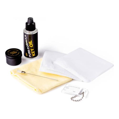 Contiene: tampone per flauto HE3015, pennello per spolverino HE825, grasso per vetrini HE91, panno per lucidatura HE96, olio per chiavi a formula pura HE451