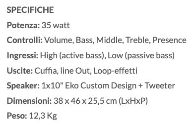 L'amplificatore per basso B 35 nasce dalla collaborazione fra Eko Guitars e il genio tecnico di Roberto Tittarelli che danno vita ad un prodotto con un ottimo rapporto qualità-prezzo e un'ottima verstilità timbrica. Due ingressi, attivo e passivo, cono da 10" e 35 Watt di potenza. Questo amplificatore è l'unico nella sua fascia di prezzo ad avere il Tweeter per conferire maggiore incisività e risaltare gli armonici dello strumento.