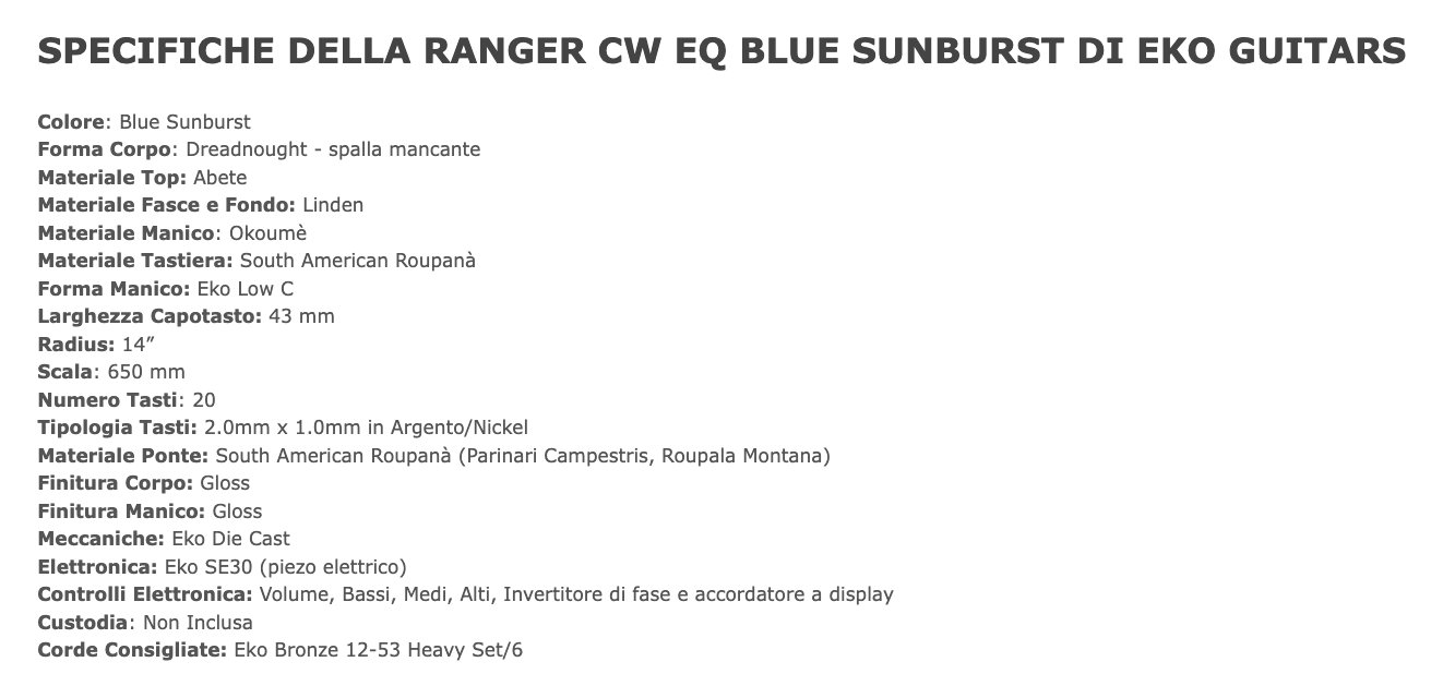 La Ranger CW EQ Blue Sunburst è la chitarra acustica elettrificata con forma Dreadnought spalla mancante di casa Eko Guitars, amplificata con sistema Eko SE30. Si presenta con Top in Abete, fasce e fondo in Linden, manico in Okoumè e tastiera in South American Roupanà.
