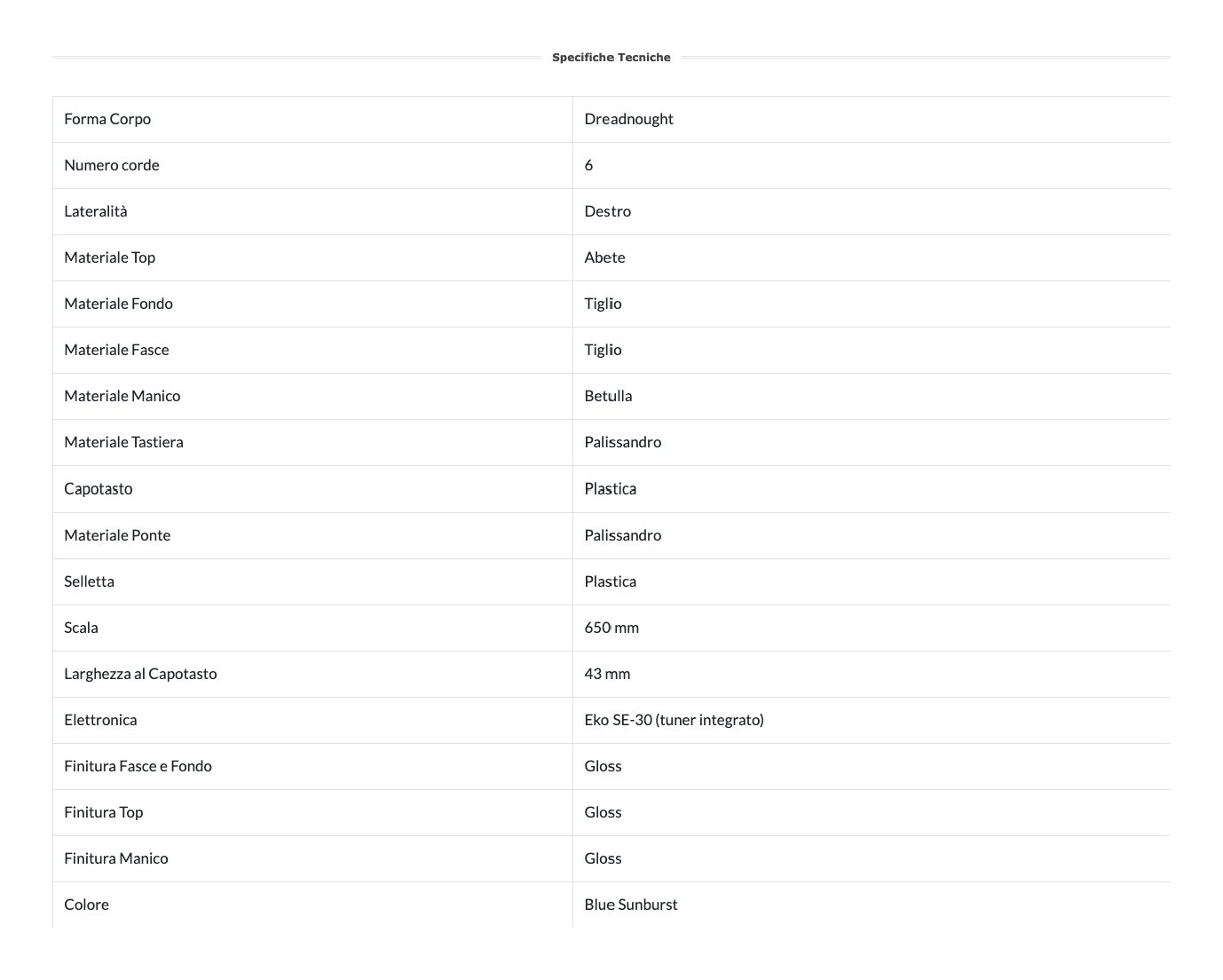 Eko Ranger 6 Eq è caratterizzata dal classico shape Dreadnought con top in Abete e fondo e fasce in tiglio. Il manico è in betulla con tastiera in South American Roupanà a 20 tasti, selletta e capotasto in plastica. Perfetta per chi fa il primo passo nel mondo della chitarra acustica.
