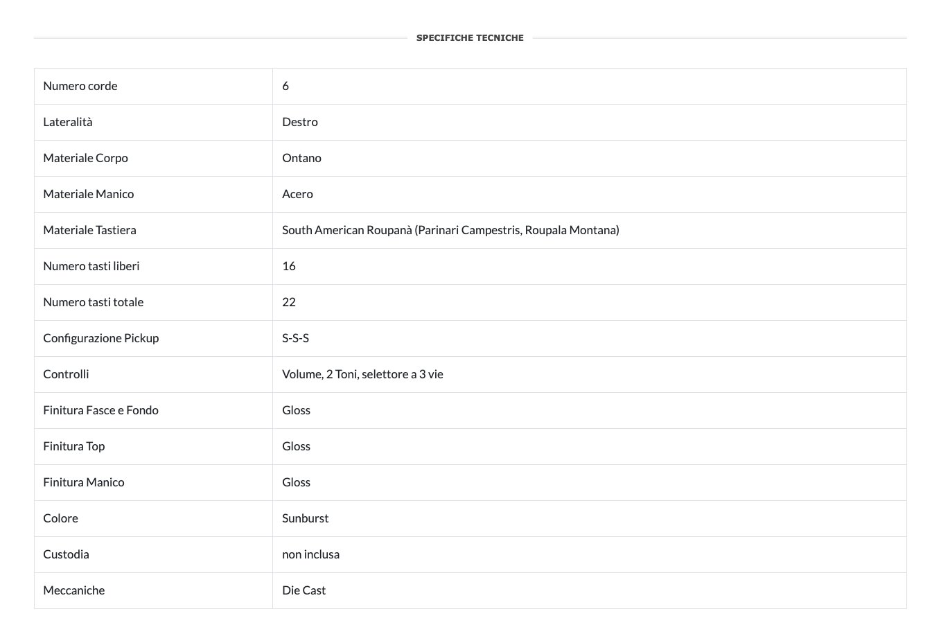 Presenta corpo in Pioppo, manico in Acero e tastiera in resina Eko WPC (Wood Polymers Composite), con finitura gloss sia sul corpo, sia sul manico. Monta 3 pickup single-coil, controlli di Volume e due toni e switch blade a 5 vie.