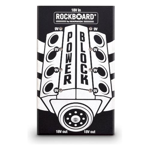 Il RockBoard Power Block è un alimentatore compatto che fornisce corrente per 10 pedali effetto. Oltre a 8 uscite da 9 V (150 mA ciascuna), il Power Block dispone anche di 2 uscite da 18 V (400 mA ciascuna).