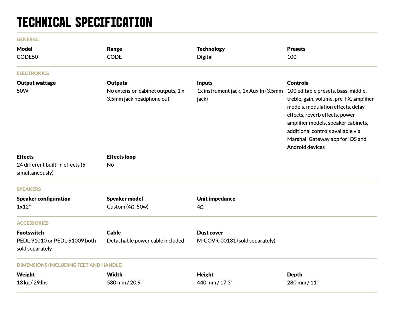Progettato per darti il massimo controllo sul tuo suono, Marshall CODE si collega all'app Marshall Gateway e MyMarshall in modo da poter creare, modificare e condividere suoni. CODE è un prodotto digitale leader che ti offre sia l'accesso ai nostri più acclamati toni Marshall, sia la possibilità di liberare la tua creatività.