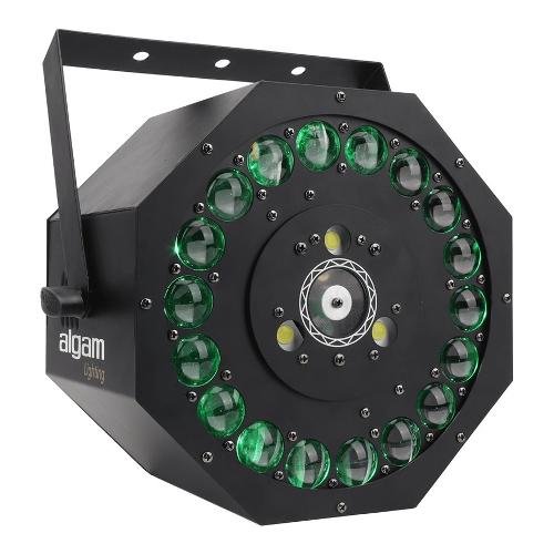Algam Lighting SUNFLOWER è uno spettacolo di luci 3 in 1 che combina un prisma rotante di 18 LED RGB, uno stroboscopio e un laser verde per sorprendenti effetti dinamici multicolore