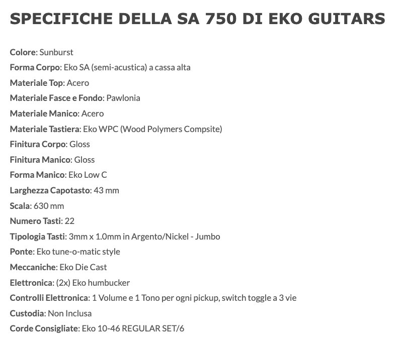 La SA 750 è la chitarra semi-acustica a cassa alta spalla mancante della serie "Tribute Jazz" di casa Eko Guitars, costruita con top in Acero, fasce e fondo in Pawlonia, manico in Acero e tastiera 22 tasti in Eko WPC. Monta due pickup Eko humbucker, selettore toggle a 3 vie, controlli di Volume e Tono per ogni pickup, ponte in stile tune-O-matic. Con look e caratteristiche di stampo vintage, risulta ideale per il chitarrista amante della musica jazz e rock 'n roll anni '50/'60.