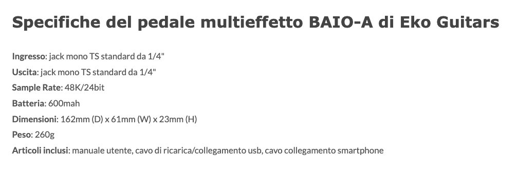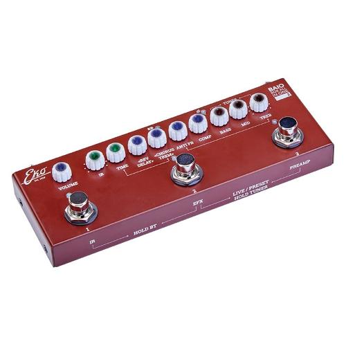 Il BAIO A è il pedale multieffetto con IR integrati per chitarra acustica, classica e basso acustico di Eko Guitars. Presenta 8 IR di strumenti acustici microfonati, controlli di tono completi, compressore, antifeedback, chorus, tremolo, reverb, delay, tuner incorporato con funzione di mute, ingresso e uscita jack per strumento, uscita stereo per le cuffie, connessione bluetooth e porte usb dedicate per l'utilizzo come scheda audio in ingresso sia per PC/Mac, sia per smartphone. Il pedale ideale con cui avrai i tuoi suoni sempre con te.
