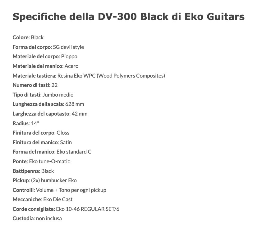 La DV-300 Black è la chitarra elettrica della serie "300" di casa Eko Guitars, ispirata alla celebre forma diavoletto. Presenta corpo in Pioppo, manico in Acero e tastiera 22 tasti in resina Eko WPC. Con finitura gloss, nut da 42mm, lunghezza di scala da 630mm, ponte in stile tune-O-matic e meccaniche Eko Die Cast, monta due pickup humbucker con controlli di volume e tono per ogni pickup e selettore toggle a 3 vie. Ideale per il chitarrista amante dello stile gibsoniano.