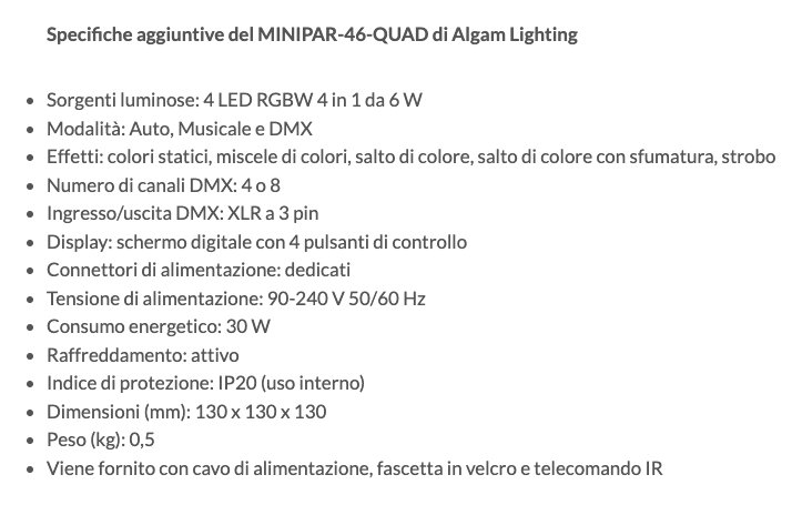 Cerchi un Par LED accessibile, compatto ed efficiente per le tue feste ed eventi privati? Ecco il MINIPAR 46 QUAD! Questo proiettore ultracompatto dotato di 4 LED RGBW da 6 Watt offre una ricca tavolozza di colori ed effetti dinamici, come effetti stroboscopici o cambio colore automatico, per creare l'atmosfera desiderata facilmente e in pochi istanti. Ingresso DMX da 4 a 8 canali per controllare il proiettore con precisione, all'interno di un impianto di illuminazione più ampio. Il telecomando IR in dotazione rende il lavoro ancora più semplice, offrendoti accesso immediato alla maggior parte delle funzioni.