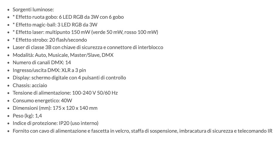 Con le sue molteplici funzionalità, questo sistema è perfetto per eventi, feste e performance dal vivo. La ruota gobo LED RGB da 6x3 Watt offre una varietà di schemi luminosi che possono essere proiettati su diverse superfici, arricchendo l'atmosfera con colori vibranti e motivi creativi. La Magic Ball, con i suoi 3x3 Watt, contribuisce a creare effetti di luce dinamici e scintillanti, mentre il laser multipunto rosso/verde riempie lo spazio con raggi luminosi che aggiungono profondità e movimento all'ambiente. Inoltre, l'effetto stroboscopico amplifica l'intensità visiva degli eventi, permettendo di giocare con il ritmo e il tempo della musica. La facilità d'uso è un altro punto di forza dell'FX-4: la modalità automatica e la modalità di rilevamento della musica consentono a chiunque, anche ai meno esperti, di avviare immediatamente un'illuminazione coinvolgente e festosa. Per i professionisti del settore, i 14 canali DMX offrono il controllo necessario per personalizzare ogni dettaglio dell'illuminazione, rendendo l'FX-4 un'opzione flessibile e potente per ogni tipo di evento. Che si tratti di feste private, concerti o eventi aziendali, l'FX-4 è progettato per trasformare qualsiasi spazio in un'esperienza luminosa indimenticabile.