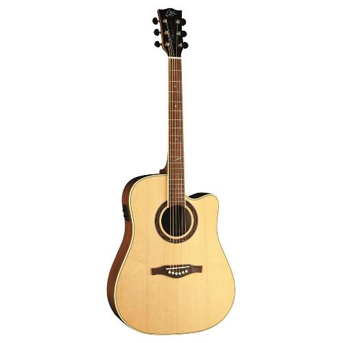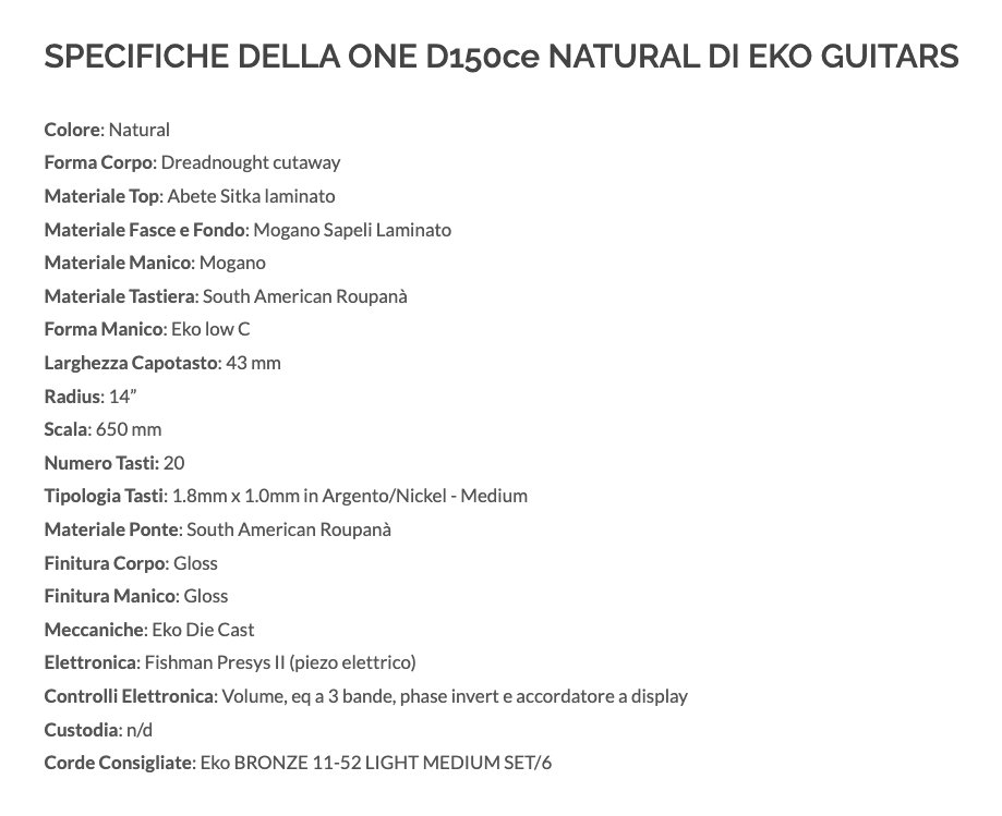 La ONE D150ce Natural è la chitarra acustica elettrificata spalla mancante con forma Dreadnought della serie "ONE" di casa Eko Guitars, amplificata con sistema Fishman Presys II. Presenta top in Abete Sitka laminato, fasce e fondo in Mogano Sapeli laminato, manico in Mogano e tastiera in South American Roupanà. È caratterizzata dalla finitura gloss su tutto il corpo, nut da 43mm e lunghezza della scala di 650mm.