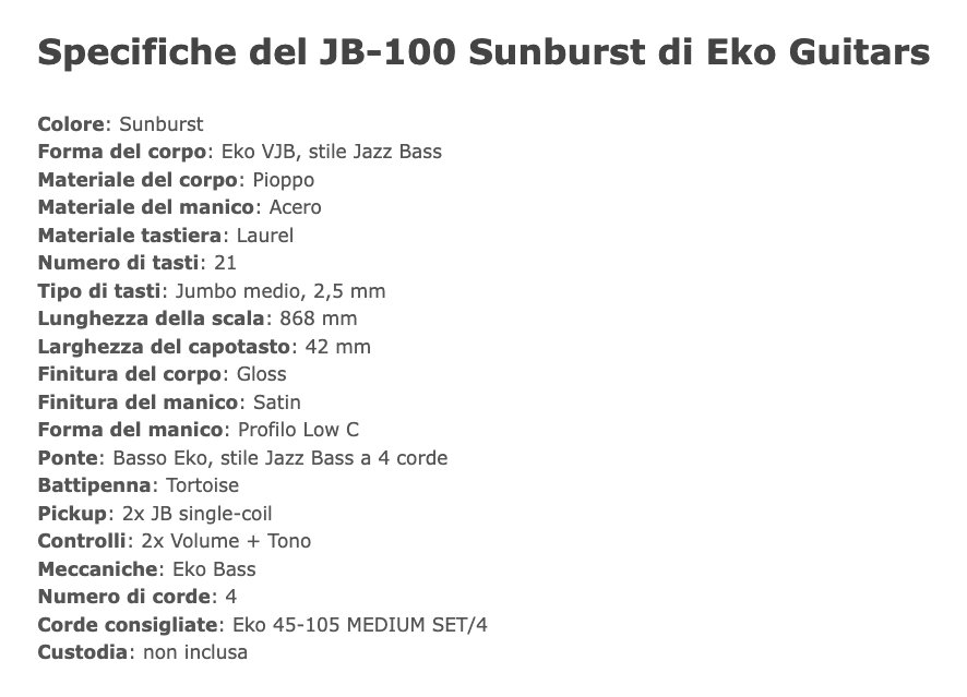 Il JB-100 Sunburst è il basso elettrico 4 corde della serie "100" di casa Eko Guitars. Ispirato al leggendario Jazz Bass, presenta corpo in Pioppo, manico in Acero e tastiera 21 tasti in Laurel. Monta due pickup JB con controlli separati di Volume e 1 tono. Ideale per il bassista che desidera uno strumento affidabile, versatile e performante.