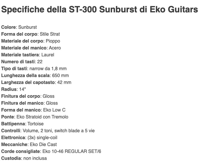Chitarra elettrica della serie "Tribute 300" ispirata ai celebri modelli strato, in colorazione Sunburst. Presenta corpo in Pioppo, manico in Acero e tastiera in Laurel, con finitura gloss sia sul corpo, sia sul manico. Monta 3 pickup single-coil, controlli di Volume e due toni e switch blade a 5 vie.
