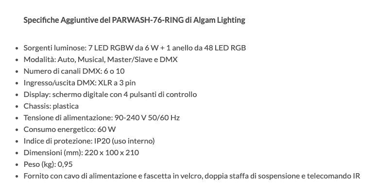 Più che un semplice PAR Wash, l'Algam Lighting PARWASH76-RING è un vero invito alla creatività. I suoi 7 LED RGBW da 6 Watt ciascuno forniscono un fascio abbagliante dai colori sfumati e vibranti, mentre l'anello LED RGB composto da 48 LED si farà notare con i suoi effetti rotanti, o per creare un alone di luce dall'impatto accattivante attorno al fascio principale. Versatile, dispone di una modalità automatica, una modalità di rilevamento della musica e una modalità DMX che consente il controllo tramite telecomando DMX, oltre al telecomando a infrarossi in dotazione