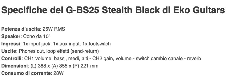 Il G-BS25 Stealth Black è l'amplificatore combo per chitarra elettrica di Eko Guitars che eroga 25W RMS di potenza con un cono da 10", in finitura Stealth Black. Presenta ingresso per chitarra, canale 1 con controlli di volume, bassi, medi, alti, canale 2 (drive) con controlli di gain e volume, switch per cambio canale, effetto reverb integrato, ingresso aux, loop effetti, ingresso footswitch per cambio canale e uscita cuffie.