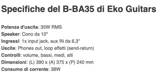 Il B-BA35 è l'amplificatore combo per basso di Eko Guitars che eroga 35W RMS di potenza con un cono da 10". Presenta ingresso per basso, controlli di volume, bassi, medi, alti, ingresso aux da 6,3", loop effetti e uscita cuffie.