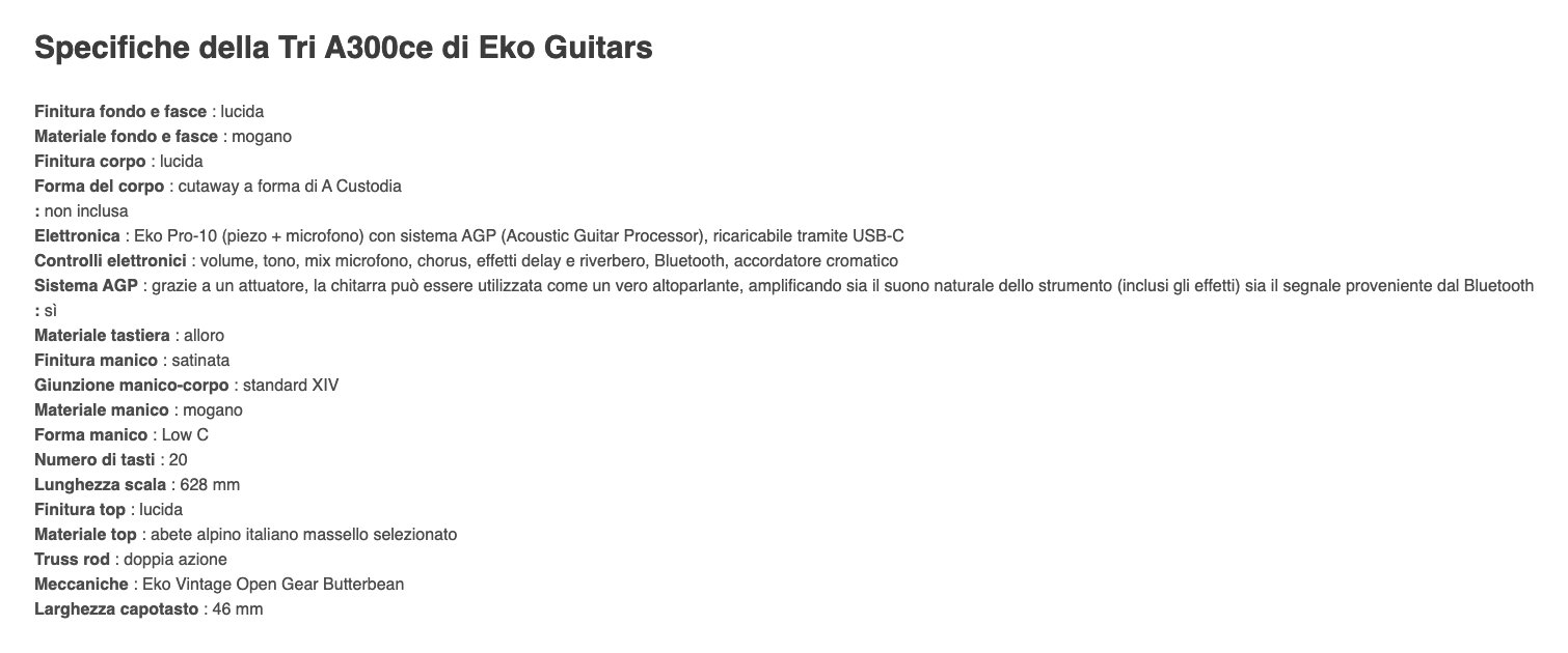 Chitarra elettroacustica Auditorium cutaway della serie "Tri", dotata del sistema di amplificazione Eko Pro-10 in grado di fornire segnale piezoelettrico, microfono interno, effetti chorus, riverbero e delay integrati, Bluetooth e un attuatore che trasforma la chitarra in un altoparlante di risonanza. È costruita con tavola armonica in abete alpino italiano selezionato, fondo e fasce in mogano, manico in mogano e tastiera in alloro. Un'altra caratteristica distintiva è la porta Soundport laterale, che consente al chitarrista di ascoltarsi più chiaramente.