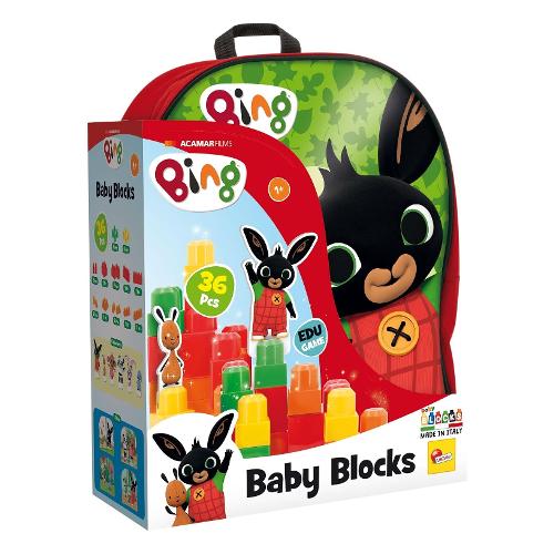 Con i baby blocks di bing il bambino acquisirà consapevolezza dello spazio, affinerà la sua manualità stimolando la fantasia e la logica. Nello zaino sono inclusi: